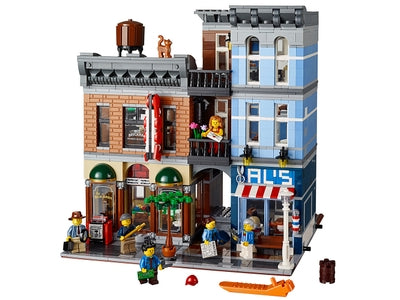 Ontdek een geheimzinnige en avontuurlijke wereld met het LEGO® Creator Expert detectivekantoor! De poort geeft toegang tot de kapperszaak met een grote spiegel waar de haren van de klanten worden geknipt. Een deur verderop, in de bar met de grote plafondventilator, kunnen poolbiljart en darts worden gespeeld. Op de eerste verdieping vind je het kantoor van de detective met een bureau vol sporen, een kluis met bewijsmateriaal en een verborgen ruimte in de muur. In de badkamer staat een ouderwets toilet en via de trap kom je in de keuken en op het dakterras in echte New York-stijl. Deze set is de nieuwste toevoeging aan de LEGO Modular Buildings-serie, vol fantastische details en verborgen verrassingen. Het dak en de plafonds kunnen snel worden verwijderd zodat het spannende interieur kan worden bekeken. Aan de buitenkant heeft het gebouw een decoratieve daklijn en een mooie gevel. Wie kan het smokkelaarsmysterie oplossen? Inclusief 6 minifiguren met diverse accessoires: Detective Ace Brickman, Al de kapper, dart-speler, pool-speler, politie agente en een mysterieuze, in het rood geklede dame.