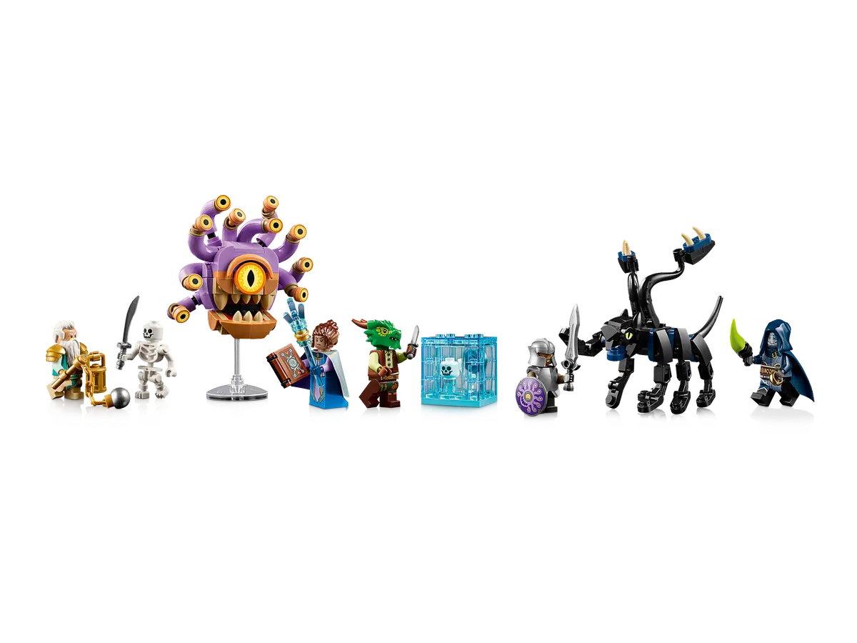 - Mythical creature figures – Includes an elf wizard, a dwarf cleric, a gnome fighter, an orc rogue and dragonborn Alax Jadescales LEGO® minifigures, plus monsters such as an owlbear and a beholder