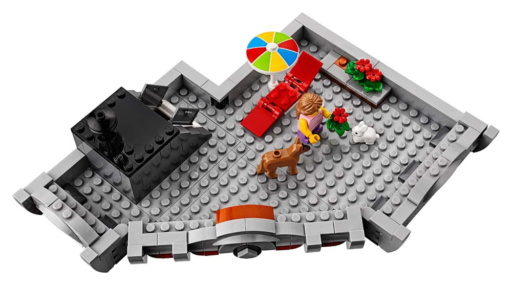 - De geavanceerde bouwset Garage op de hoek met 3 verdiepingen bevat veel verschillende van stenen gebouwde details, waaronder een gedetailleerde gevel in jaren 1950-stijl met uithangbord, ramen, erkers, gewelfde deuropening, roldeur van de garage, decoratieve daklijn en een dakterras, plus een gedetailleerde stoep met boom en fraaie lantaarnpaal. Deze set bevat ook een sleepwagen en een scooter.
