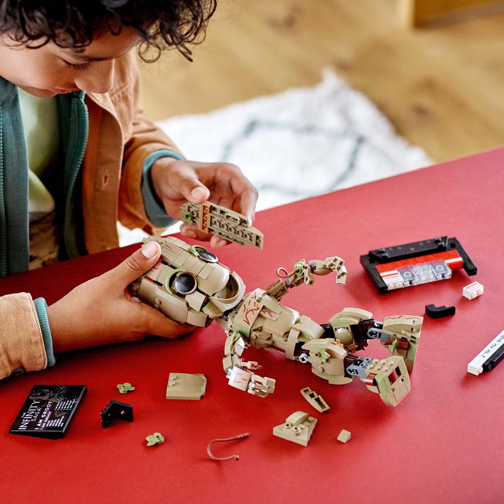 - Beroemd Marvel personage – kinderen bouwen hun eigen baby Groot uit Guardians of the Galaxy Vol. 2 van Marvel Studios. De set bevat ook een speelgoedcassette en een naamplaatje