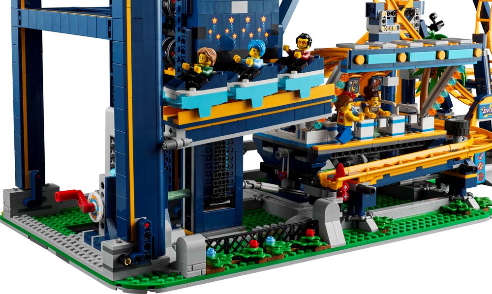 Deze door de zwaartekracht aangedreven achtbaan heeft 1 treintje, een station met hekjes die open kunnen en een bedieningspaneel. Breng de beugels omlaag zodat de passagiers veilig in de karretjes blijven zitten. Laat de rem los. Activeer de lift en kijk hoe de karretjes door de bochten en loopings zoeven. Upgrade de achtbaan met LEGO Powered Up (apart verkrijgbaar) om de lift te motoriseren. Met accessoires zoals een bankje met plattegrond, ballonkar, pretzelkar, hotdogkraam en lengtestok.