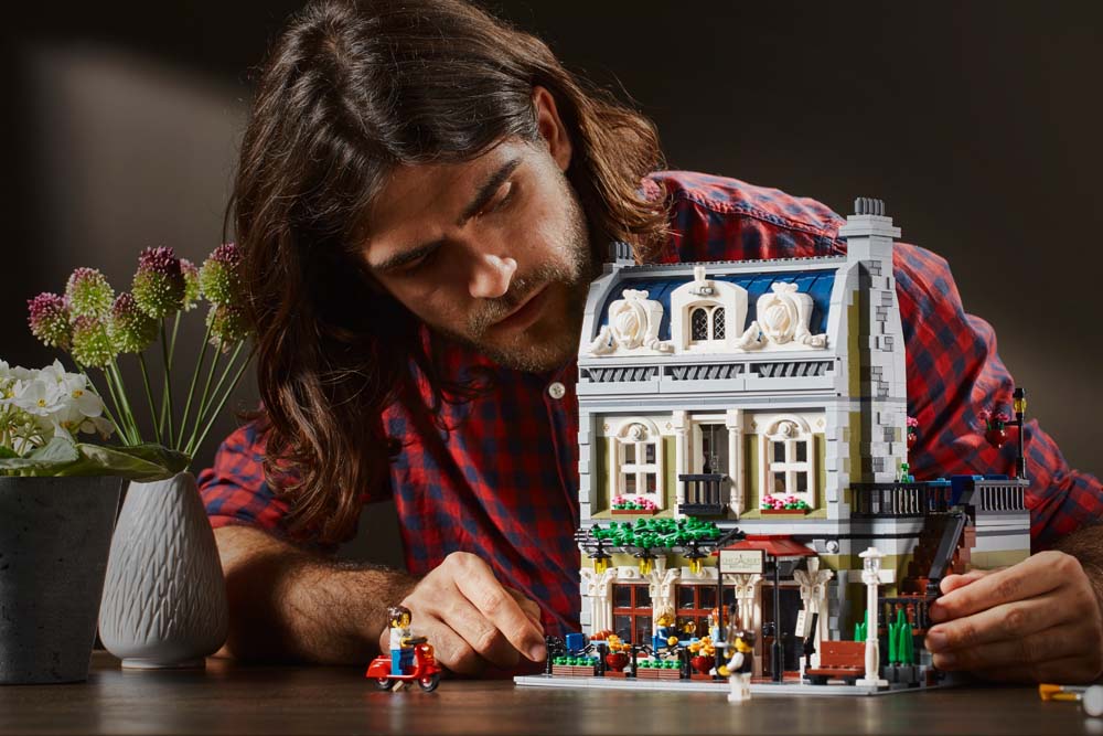 Het is erg druk in het Parijse restaurant. Een scooter zoeft voorbij, binnen haast de ober zich van tafel naar tafel terwijl een jongeman zich zenuwachtig klaarmaakt om zijn geliefde met een ring ten huwelijk te vragen! Ook in de keuken waar de chef het eten klaarmaakt, is het een drukte van jewelste. Dit prachtig gedetailleerde gebouw vormt het decor voor zoveel verhalen en is een mooie aanvulling op de modulaire gebouwenreeks. Het Parijse restaurant is helemaal uitgerust met blauwe en witte tegels in de keuken, tafelgerei en een gezellig appartement met kantelend bed, keukentje en open haard. Op de bovenverdieping bevindt zich de kamer van een kunstenaar en een studio met een ouderwetse kachel, schildersezel, penseel en twee kunstwerken door deze veelbelovende artiest. Buiten bevindt zich een trap naar het dakterras, afgewerkt met hangende lantaarns en bloemen waar de klanten in alfrescostijl kunnen eten. Dit model van een prachtig Parijs restaurant bevat zelfs een gevel met croissant-, schelp- en pluimdetails om de sfeer van Parijs na te bootsen. Met 5 minifiguurtjes: chef, ober, meisje en een romantisch koppel.