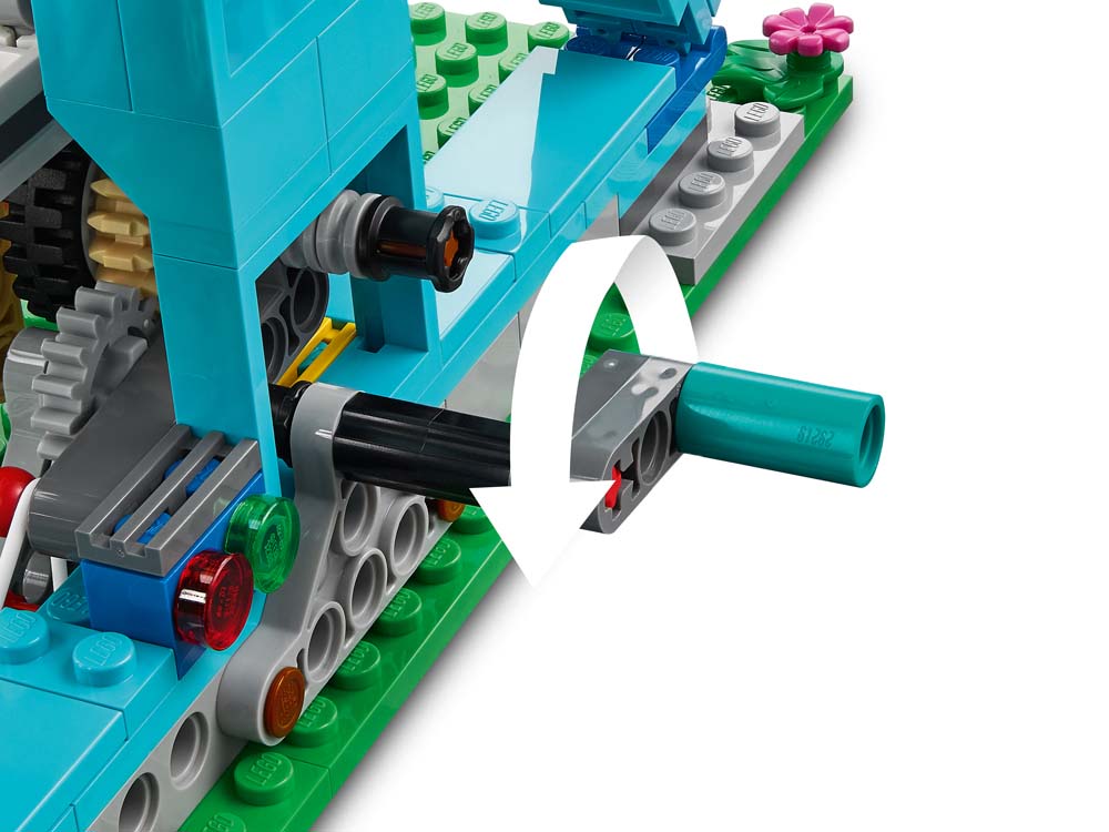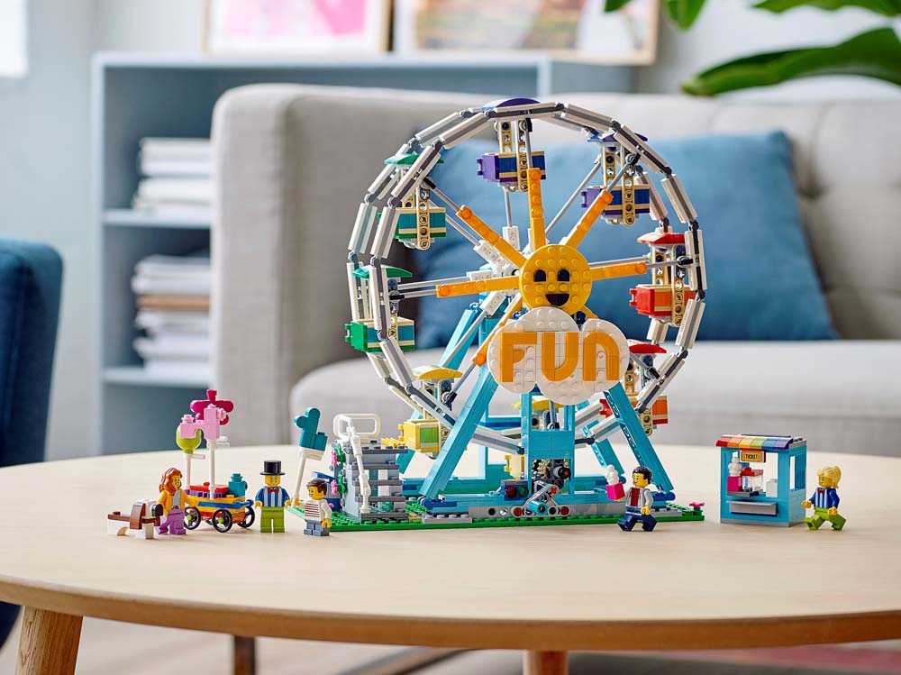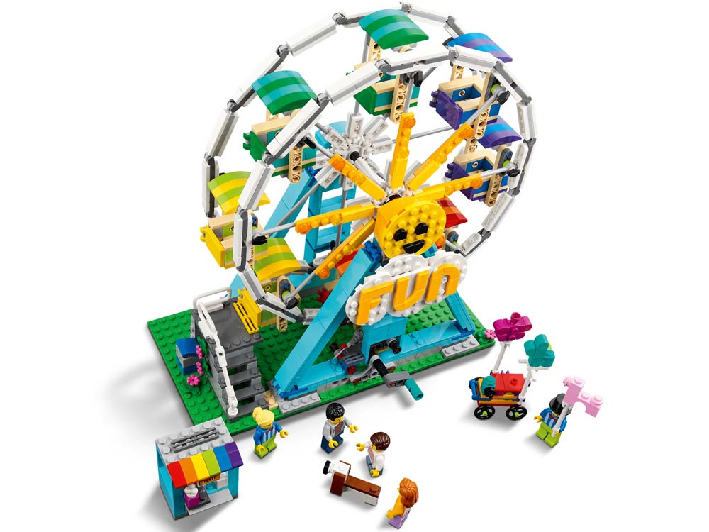 - Het draaibare reuzenrad beschikt over 8 gondels waar minifiguren in kunnen zitten, een kaartjesloket, een ballonkraampje met ballondieren en een bouwbare hond.