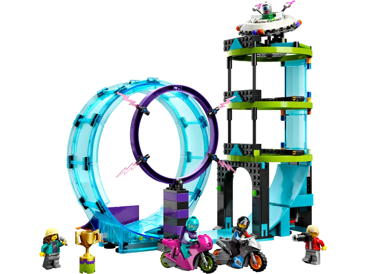 De LEGO® City Ultieme stuntrijders uitdaging (60361) staat garant voor urenlang speelplezier vol actie. Deze set voor kinderen van 7 jaar en ouder bevat 2 stuntmotoren en 3 stunttoestellen die kunnen worden gecombineerd: een 360° looping, een ring van vuur en een 'buitenaardse' toren. Kinderen kunnen hun vaardigheden op de proef stellen, geweldige shows opvoeren en met vrienden en familie strijden om de trofee.