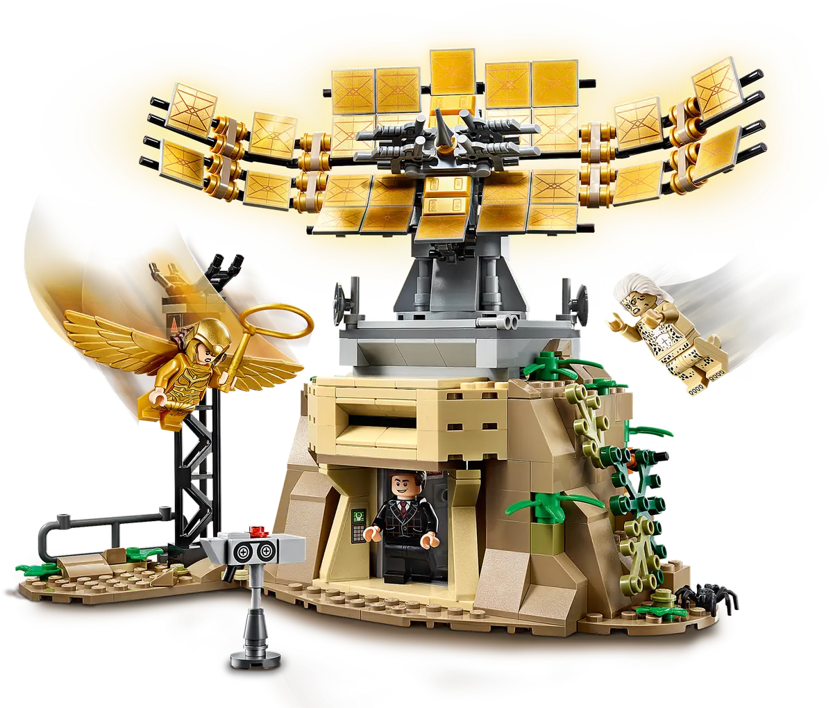 • A winged Wonder Woman™ and Cheetah minifigures provide super-hero action, while a Max™ minifigure is at the control center. High above, the transmitter tower rotates through 360 degrees and up and down.