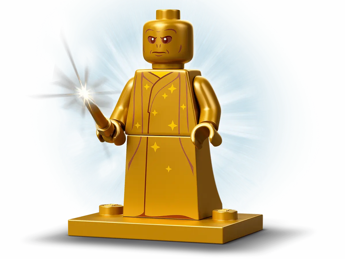 - De set bevat een exclusieve gouden minifiguur van Voldemort™ ter ere van 20 jaar LEGO® Harry Potter™ magie. In de set vind je ook 6 willekeurige tovenaarskaarttegels die kinderen kunnen verzamelen (van de 16 in totaal).